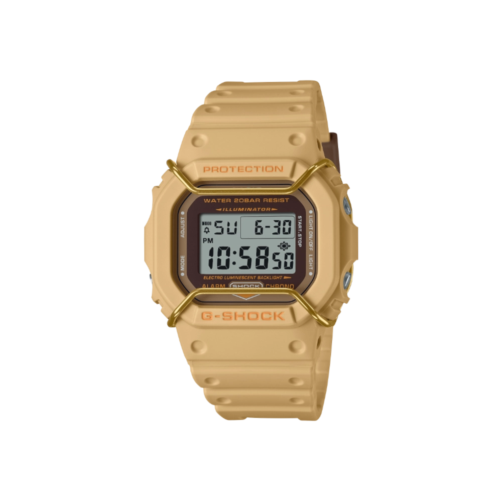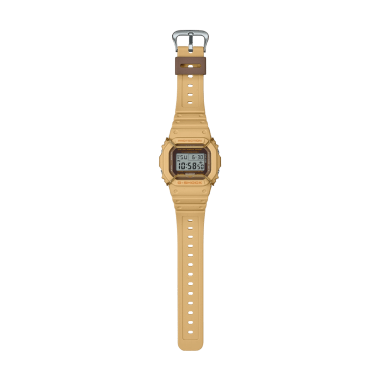 The Casio G-Shock DW-5600PT-5, part of the Tone-on-Tone series, showcases a beige resin case and band with a matching metallic face protector, offering a cohesive monochromatic aesthetic.