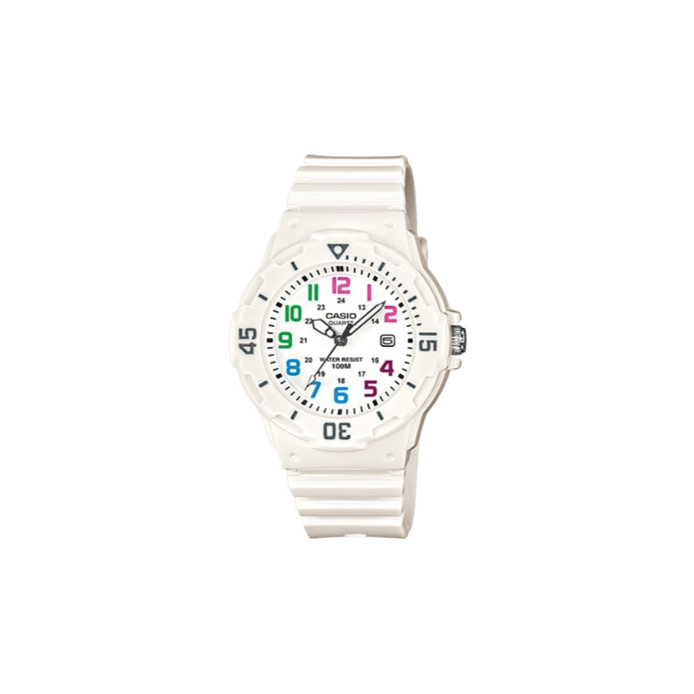 The Casio LRW-200H-7BV is a women’s analog watch that combines functionality with a sleek design. Its white resin case measures 38.9mm in length, 34.2mm in width, and 11.5mm in height, offering a comfortable fit for daily wear. The watch features a matching white resin band and a bi-directional rotating bezel, enhancing its diver-inspired aesthetic.