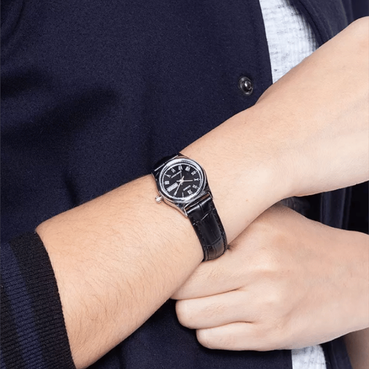 The Casio LTP-V006L-1B is a women’s analog watch that combines classic design with practical features. Its chrome-plated case measures 30.4mm in length, 25mm in width, and 9.2mm in thickness, offering a sleek profile suitable for various occasions. The black dial features Roman numeral indices, enhancing its timeless appeal. A day and date display is conveniently positioned for easy reference. The watch is equipped with a genuine black leather band, providing both comfort and durability. Protected by mineral glass, the dial ensures clarity and resistance to minor scratches. With water resistance, it can handle everyday splashes without concern. Powered by a reliable quartz movement, the LTP-V006L-1B maintains accurate timekeeping with a precision of ±20 seconds per month. The battery life is approximately three years on an SR626SW battery, reducing the need for frequent replacements. Weighing just 22 grams, this timepiece is lightweight, ensuring comfortable wear throughout the day.