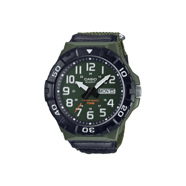 Equipped with a green cloth band, the MRW-210HB-3BV provides a secure and comfortable fit, suitable for extended use. Its 100-meter water resistance makes it apt for swimming and snorkeling, though it is not recommended for diving.