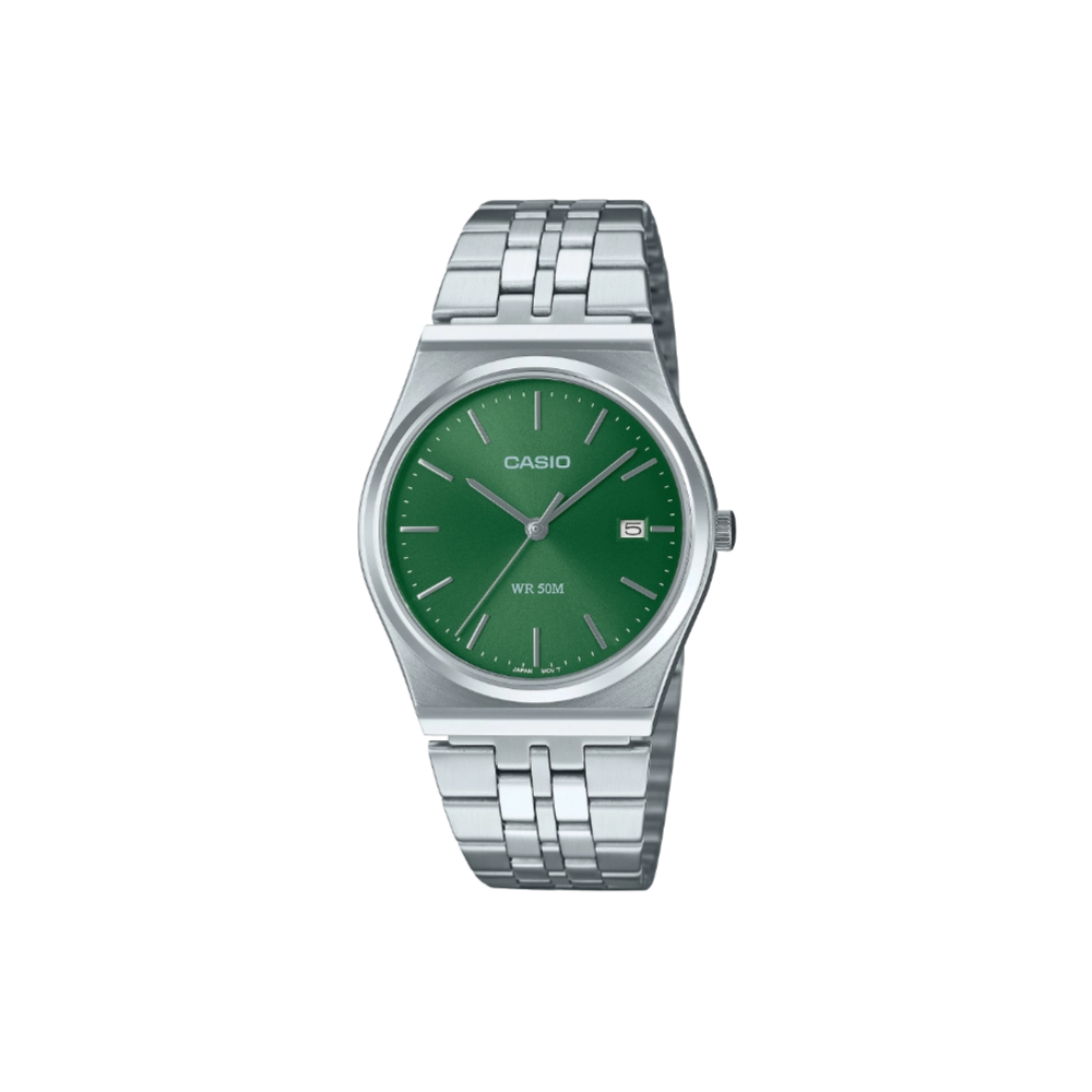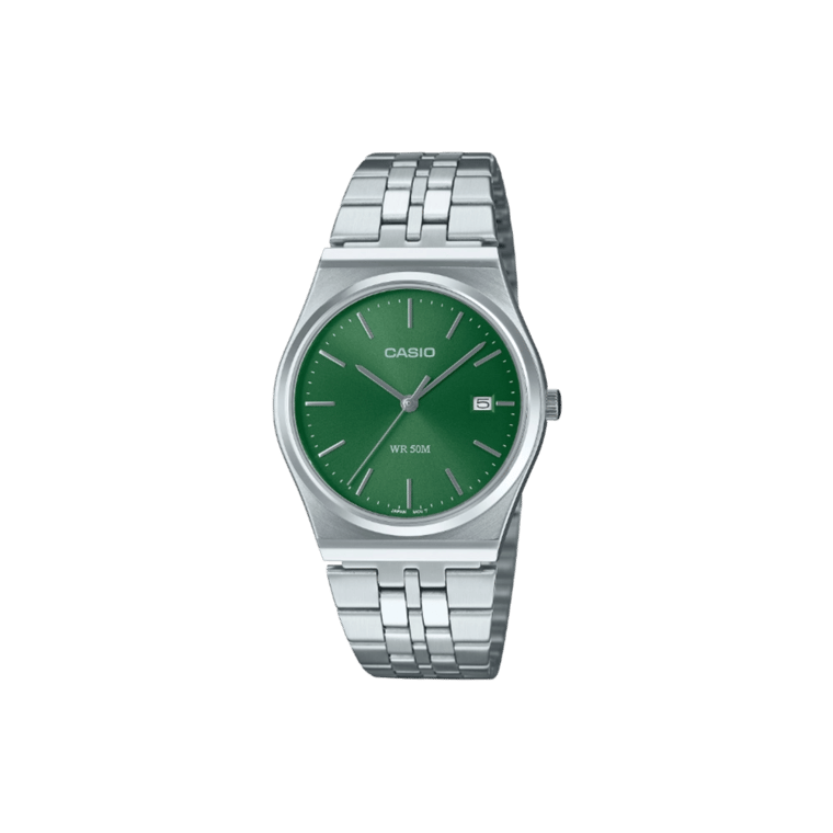 The Casio MTP-B145D-3AV brings a clean, vintage-inspired aesthetic into a modern form with its understated green dial and minimalist layout. Anchored by a dependable quartz movement, this analog timepiece draws attention not through complexity, but through precision in design and balance. Its retro influence is evident in the domed mineral crystal and classic round case silhouette, paired with a stainless steel bracelet that reinforces its old-school appeal.