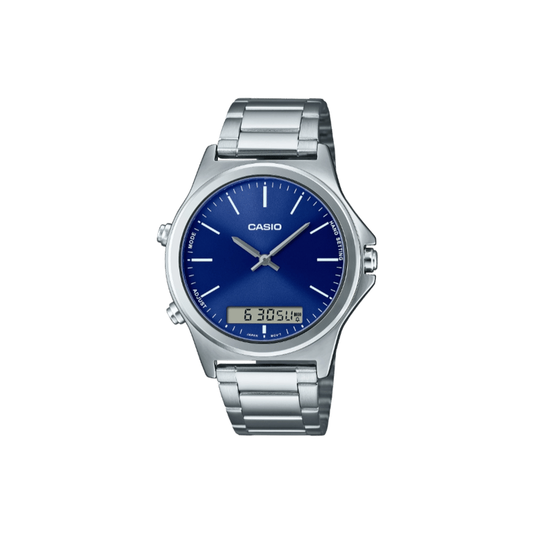 The Casio MTP-VC01D-2E seamlessly blends classic analog aesthetics with modern digital functionality. Its minimalist design features a clean blue dial, ensuring easy readability. The watch incorporates a digital display that offers a 1/100-second stopwatch, auto-calendar, and dual time zones, making it a versatile companion for global travelers. Crafted with a stainless steel band secured by a triple-fold clasp, it provides both durability and comfort. The mineral glass protects the 46.5 × 41.6 × 8.9 mm case, and the entire timepiece weighs approximately 95 grams. Powered by a reliable quartz movement, it boasts an approximate battery life of three years on an SR920W battery. With water resistance, this watch is suitable for daily wear, ensuring functionality without compromising style.