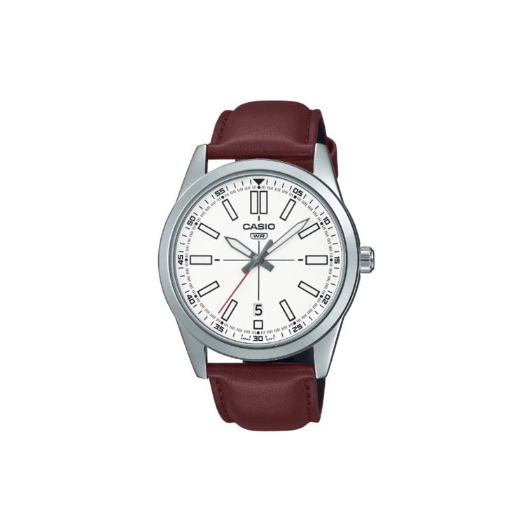 The Casio MTP-VD02L-7E offers a classic timepiece in a sporty design streamlined for casual sophistication. Its minimalist analog display features a convenient date window at the 6 o’clock position, enhancing daily utility. The watch measures 48mm in length, 41mm in width, and 9.6mm in height, with a total weight of 55 grams, ensuring a comfortable fit on the wrist. The white dial is protected by a mineral glass crystal, providing durability against daily wear. Encased in stainless steel, the watch is paired with a brown leather strap, offering a timeless aesthetic suitable for various occasions. Powered by a reliable quartz movement, it maintains an accuracy of ±20 seconds per month. The timepiece is water-resistant, allowing for worry-free use during daily activities such as washing hands or unexpected rain showers. With an approximate battery life of three years on an SR626SW battery, the MTP-VD02L-7E ensures longevity and dependable performance.