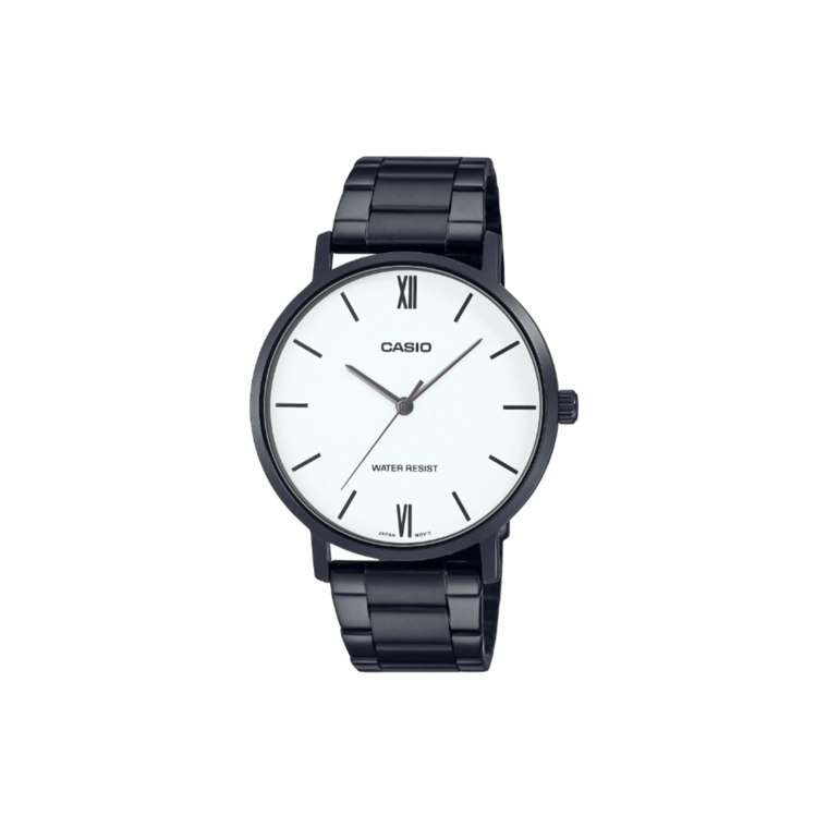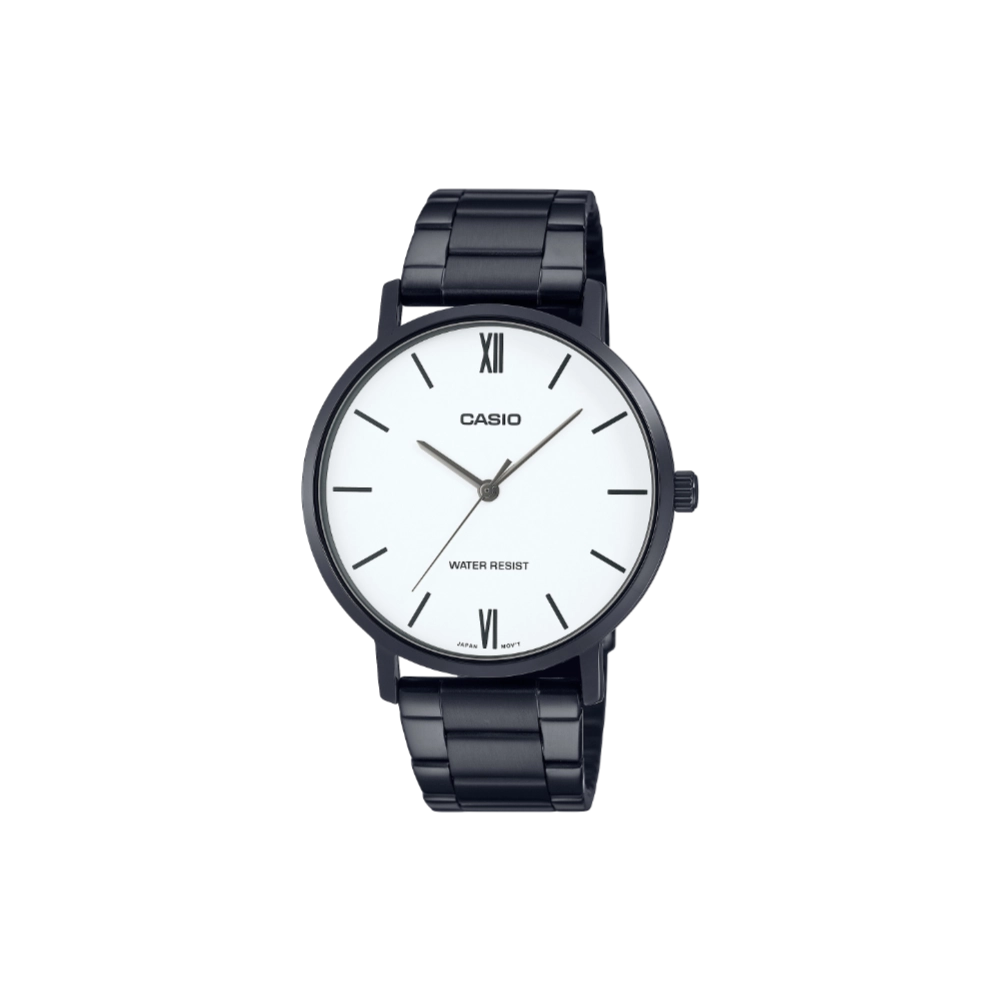 The Casio MTP-VT01B-7B embodies minimalist elegance, featuring a clean white dial accented by mixed numeral and bar indexes. Its black ion-plated stainless steel case measures 46mm in length, 40mm in width, and a slim 8.2mm in height, offering a comfortable fit for daily wear. The watch is equipped with a durable stainless steel band secured by a triple-fold clasp, ensuring both style and security. Powered by a reliable quartz movement, it maintains accurate timekeeping with a precision of ±20 seconds per month. The mineral glass protects the dial, while the watch’s water resistance allows for worry-free use during everyday activities, including exposure to rain. With an approximate battery life of three years on an SR626SW battery, the MTP-VT01B-7B is as dependable as it is stylish.