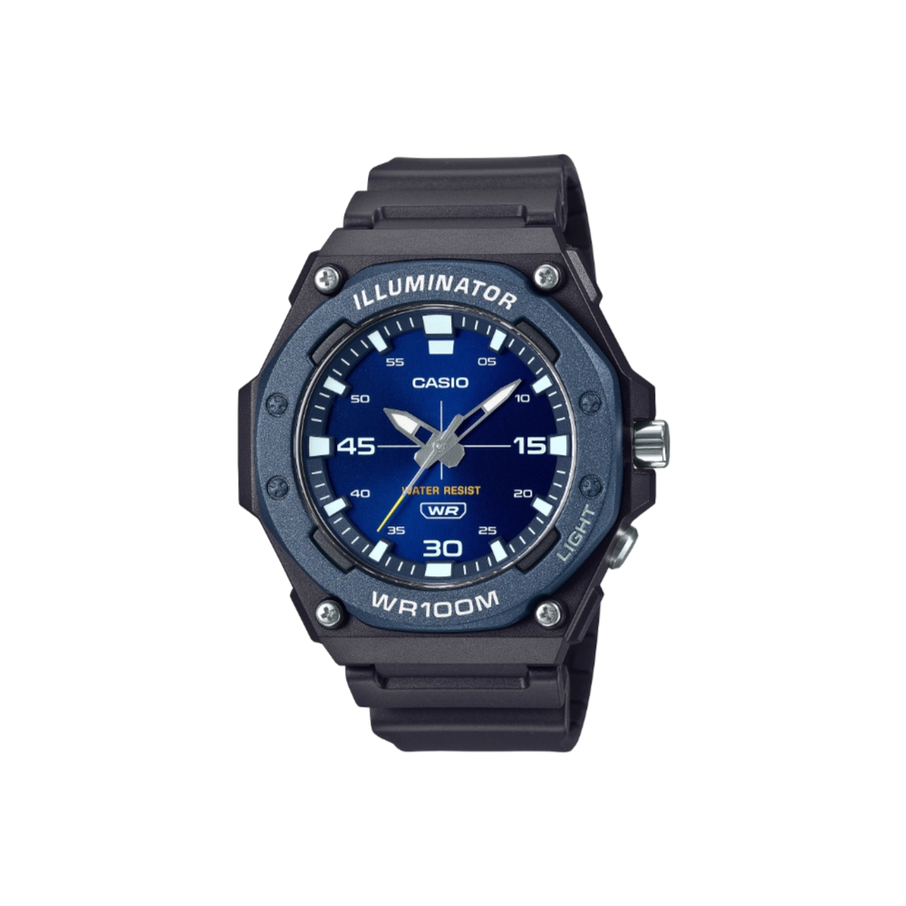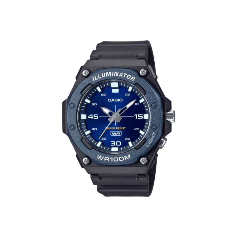 The Casio MW-620H-2AV is engineered for durability and clarity. Its substantial 46.1 mm resin case houses a sunray blue dial, complemented by a metallic-finished bezel. High-visibility bar index marks and an LED backlight ensure optimal readability in various lighting conditions.