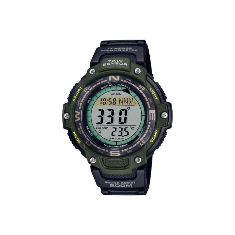 Built to withstand challenging conditions, the SGW-100-3AV boasts a 200-meter water resistance and is low-temperature resistant down to -10°C (14°F). Its case, measuring 51.5 × 47.6 × 13.2 mm, is crafted from durable resin and aluminum, complemented by a comfortable resin band. The large LCD is divided into three segments for a clear, easy-to-understand presentation of data, and mineral glass is used to protect against scratching.