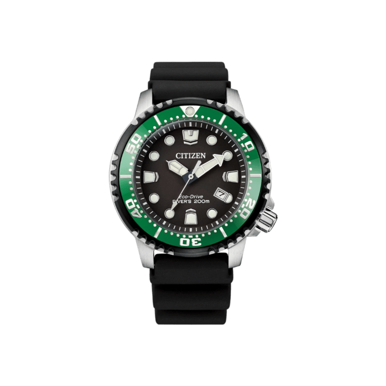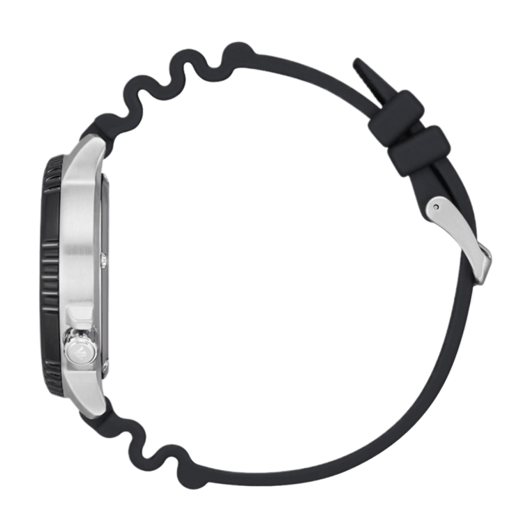 The Citizen BN0155-08E Promaster Diver is a robust timepiece designed for underwater exploration. Featuring a 44mm silver-tone stainless steel case, it is complemented by a black polyurethane strap, ensuring durability and comfort during dives. The black dial is framed by a distinctive green one-way rotating bezel, allowing divers to track elapsed time accurately. Luminous hands and markers enhance readability in low-light conditions, a crucial feature for deep-sea adventures. Powered by Citizen’s Eco-Drive technology, the watch harnesses light from any source, eliminating the need for battery replacements. It is ISO-compliant for water resistance up to 200 meters, making it suitable for scuba diving. The anti-reflective mineral crystal protects the dial from scratches and reduces glare, ensuring clear visibility. With a lug width of 20mm and a band length of 266.7mm, the watch offers a secure fit on the wrist. The BN0155-08E continues Citizen’s legacy of producing reliable and innovative dive watches, embodying the brand’s commitment to quality and performance.
