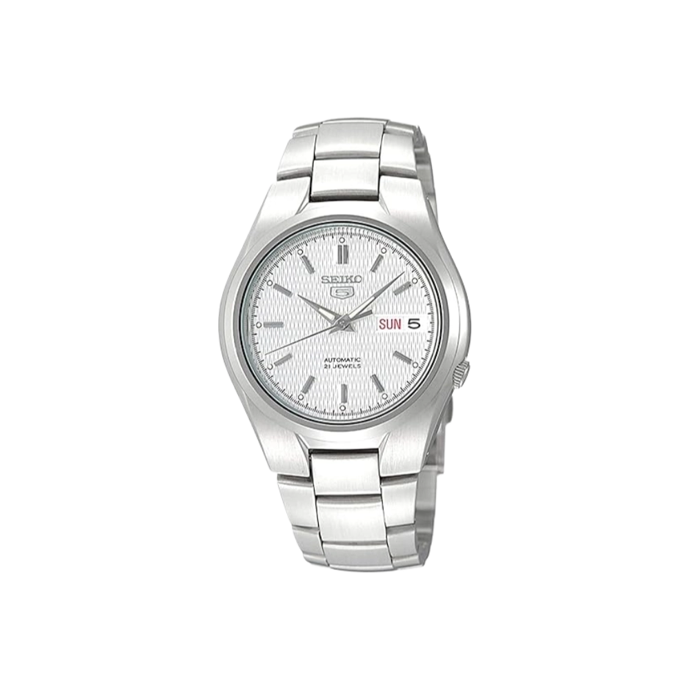 The Seiko 5 SNK601 features a stainless steel case and bracelet, paired with a fixed smooth stainless steel bezel. Its silver textured dial includes luminous silver-tone dauphine-style hands and index hour markers, with minute markers along the outer rim. The analog display includes a day and date window at the 3 o’clock position.