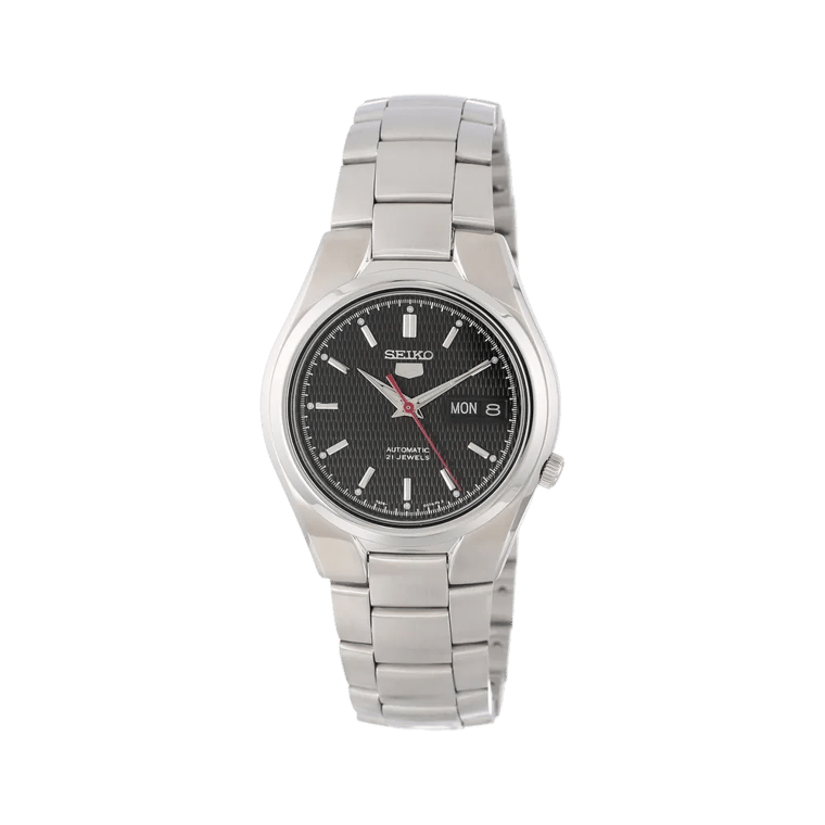 The black dial features a subtle textured pattern that adds visual depth, complemented by applied silver-tone index markers and a mix of baton and Roman-style hour markers at 12 o’clock. A red seconds hand provides a sporty accent against the dark dial, while the day-date window at 3 o’clock adds practical functionality. The Seiko 5 shield sits proudly below 12, marking this as part of the legendary automatic lineup.