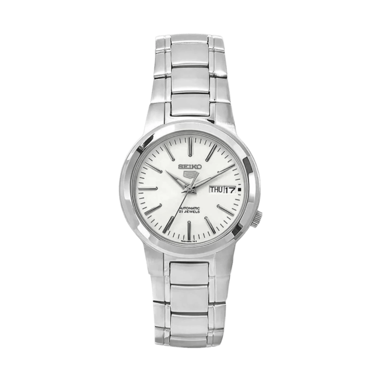 Meet the Seiko SNKA01, a timepiece that effortlessly balances functionality and style. With its robust stainless steel case and bracelet, this watch is built for everyday wear while making a statement. The pristine white dial, accented by luminous silver-tone hands and sleek hour markers, ensures you’ll always be on time day or night.