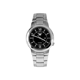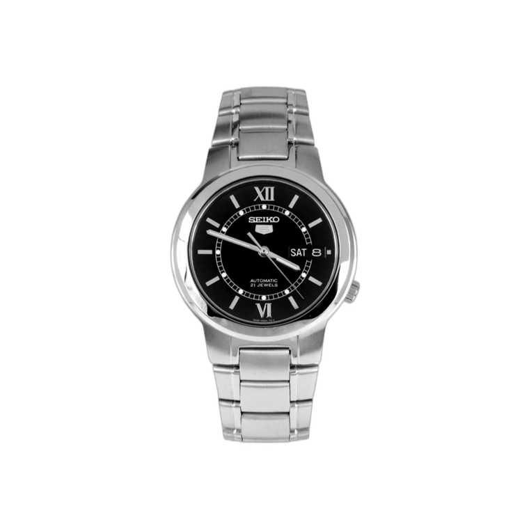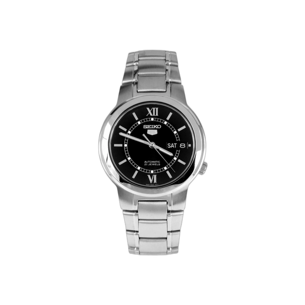 The Seiko 5 SNKA23 features a stainless steel case with a brushed stainless steel bracelet and a fixed stainless steel bezel. Its black dial is designed with luminous silver-tone hands and index hour markers, with Roman numerals marking the 6 and 12 o’clock positions. The dial also includes minute markers and a day-and-date display at the 3 o’clock position.