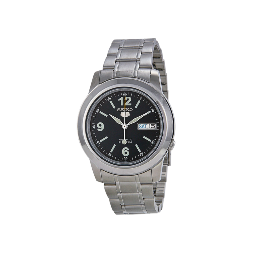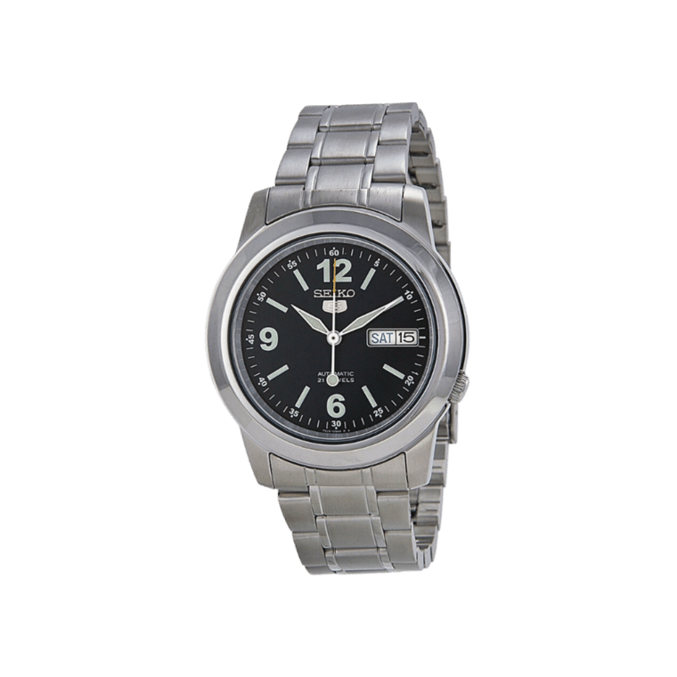 The Seiko 5 SNKE61 features a stainless steel case and bracelet, complemented by a fixed stainless steel bezel. Its blue dial is adorned with luminous silver-tone hands, index hour markers, and Arabic numerals at the 6, 9, and 12 o’clock positions. The dial also includes Arabic numeral minute markers at 5-minute intervals and minute markers around the outer rim. A day-and-date display is conveniently positioned at 3 o’clock.