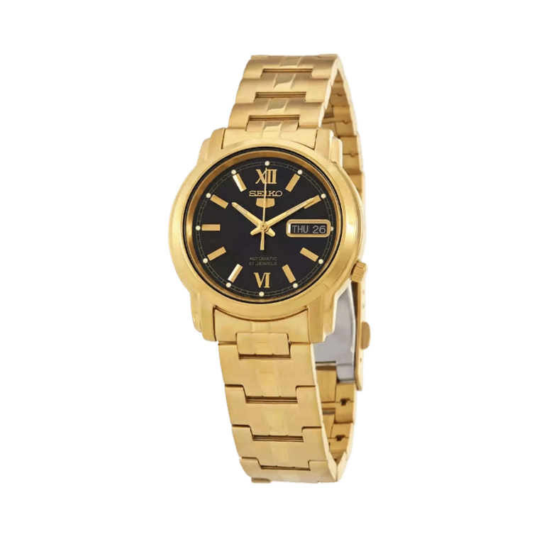 The Seiko SNKK86, a distinguished model within the celebrated Seiko 5 series, features a 38mm gold-tone stainless steel case with a sleek 11mm profile. Its black dial, accentuated by luminous gold-tone hands and hour markers, ensures both style and functionality. A day-date display at 3 o’clock adds practical convenience while maintaining the watch’s balanced aesthetic.