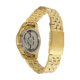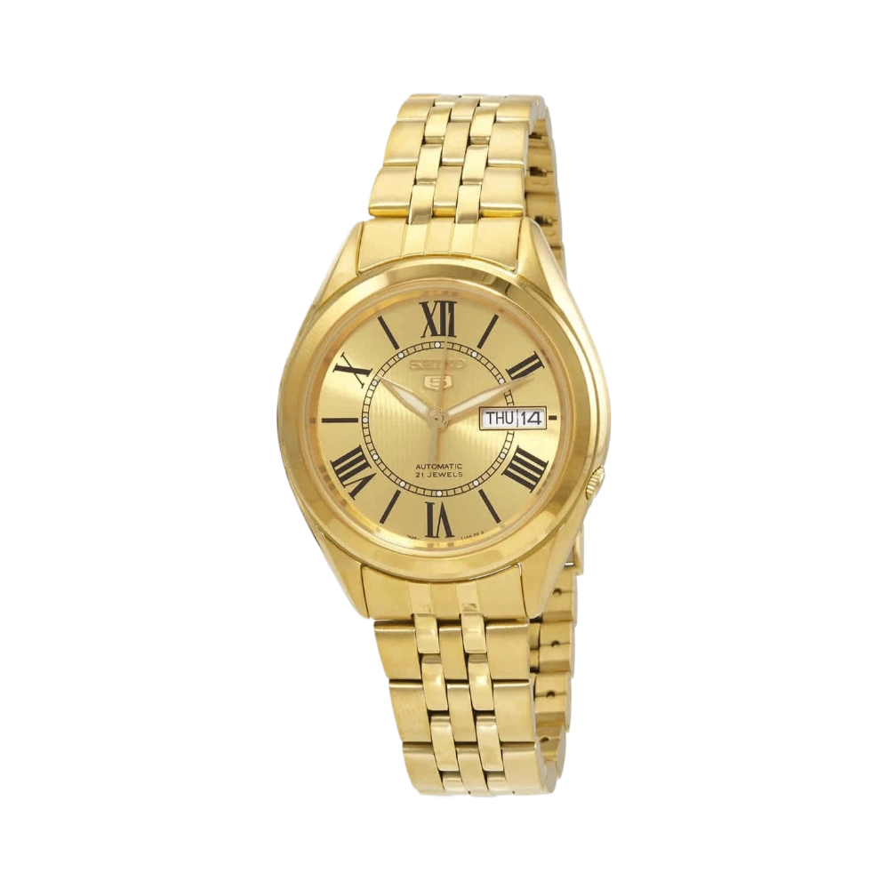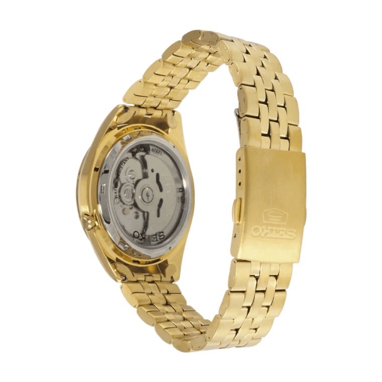 The Seiko SNKL38, part of the esteemed Seiko 5 series, showcases a gold-tone stainless steel case measuring 38mm in diameter and 11mm in thickness. Its gold dial features yellow gold-tone hands and alternating Roman numeral and index hour markers, complemented by minute markers along an inner ring. The watch is protected by a scratch-resistant Hardlex crystal and includes a day and date display at the 3 o’clock position.