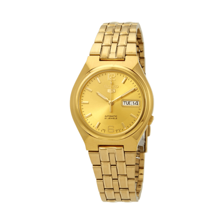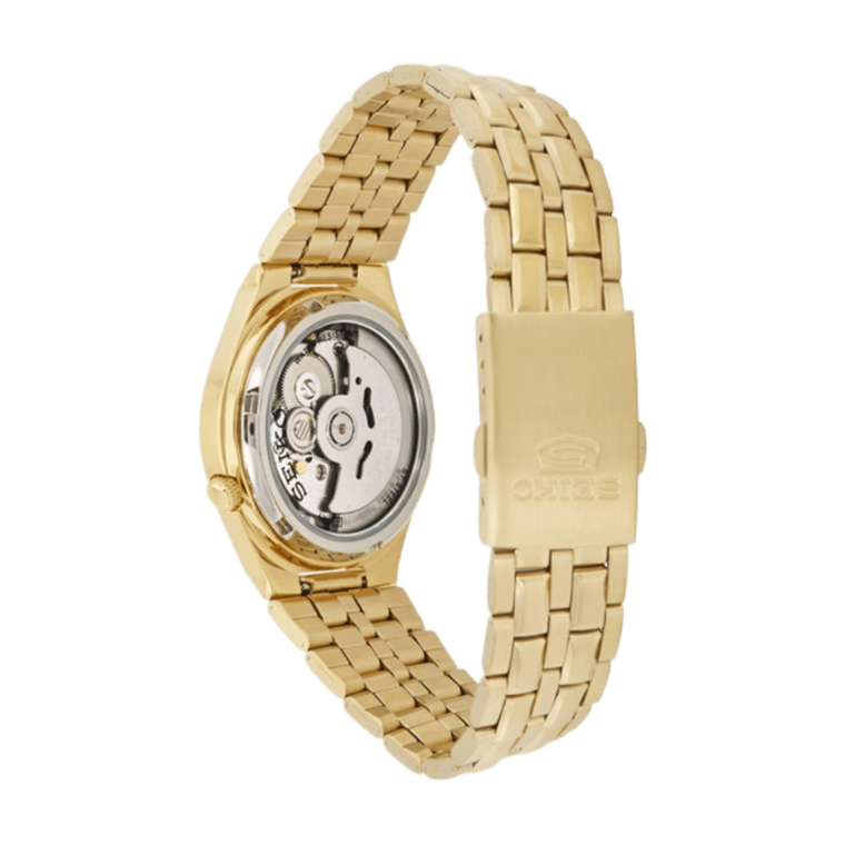 The Seiko 5 SNKL64 features a gold-tone stainless steel case and bracelet with a fixed gold-tone bezel. Its gold-tone dial is accented by luminous gold-tone hands and index hour markers, with Arabic numerals at the 6 and 12 o’clock positions. Minute markers are displayed around the outer rim, and a day-and-date display is conveniently located at 3 o’clock.