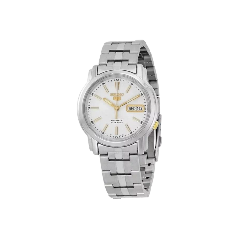 Meet the Seiko SNKL77, a timepiece that strikes the perfect balance between style and functionality. Housed in a robust stainless steel case, this watch features a sleek stainless steel bracelet that wraps comfortably around your wrist. The silver dial showcases luminous yellow gold-tone hands and index markers, ensuring you can tell time with ease, day or night.