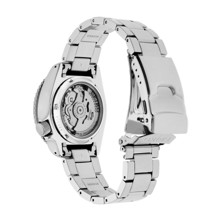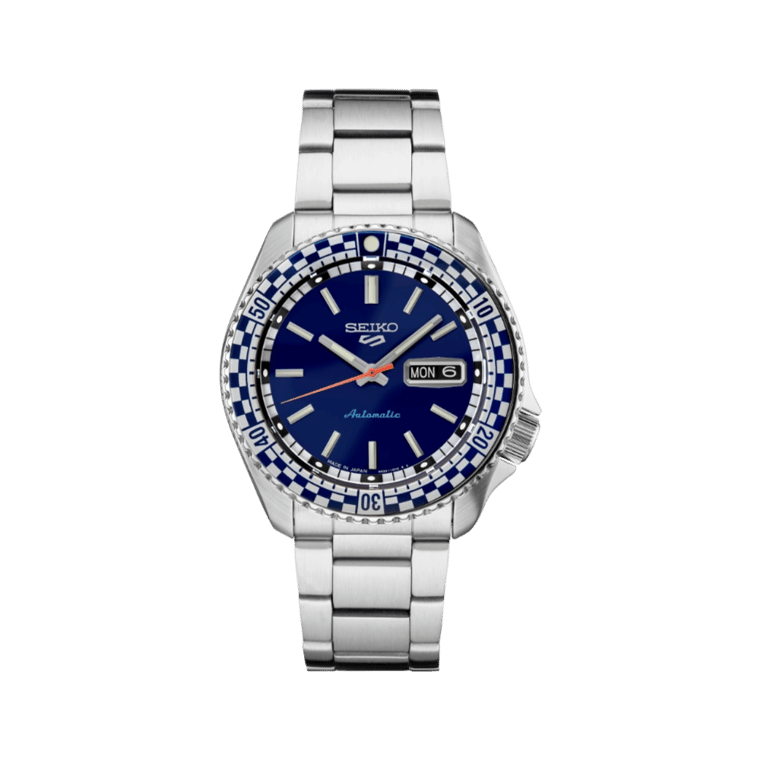 Seiko 5 Sports Special Edition. For decades, Seiko 5 Sports has delivered consistently high levels of reliability, durability, and performance. This dynamic watch offers current styling with a vintage feel, featuring an updated case and streamlined dial, while retaining the retro silver and blue color scheme. Inspired by the vintage Seiko 5 Sports models of the 1960s and 1970s, this timepiece is framed by a blue and white checkered uni-directional rotating bezel, while the blue dial with sunray finish includes a day/date calendar, red-orange second hand, and luminous hands and markers. The design takes its color scheme and bezel pattern from the “Checker Flag,” one of the most popular designs of the era. Providing automatic technology that you control with every movement, the 24-jewel movement, visible through the screwdown see-through caseback, beats at a frequency of 21,600 vibrations per hour, with a power reserve of approximately 41 hours and manual winding capability. In stainless steel with locking tri-fold push button release clasp. 10 bar, 100M Water Resistant