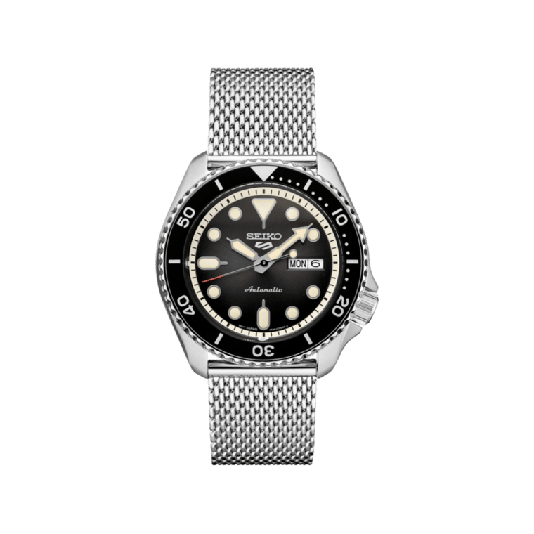 Discover the Seiko SRPD73, a striking blend of functionality and style. This 42.5 mm stainless steel watch features a durable mesh bracelet and a uni-directional rotating bezel with a sleek black ring. The bold black dial showcases luminous silver-tone hands and dot hour markers, ensuring visibility in any light.