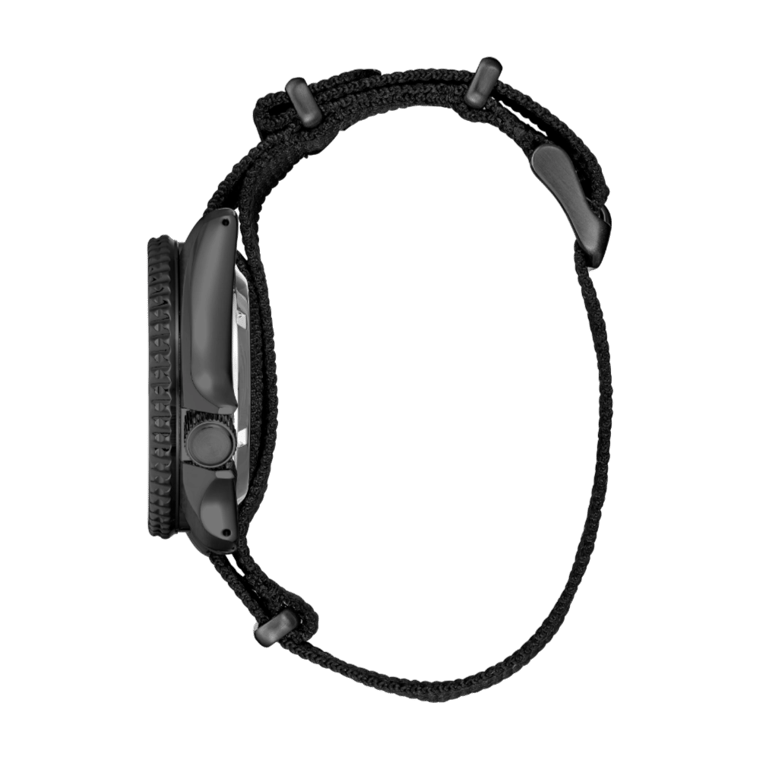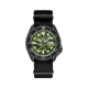 The watch is equipped with a black uni-directional rotating bezel and is protected by a Hardlex crystal. Its black nylon strap, measuring 22mm in width, secures with a three-fold clasp featuring a push-button release. The SRPJ37 is water-resistant up to 10 bar (100 meters) and offers magnetic resistance up to 4,800 A/m. A screw-down see-through case back allows for a view of the movement in action.