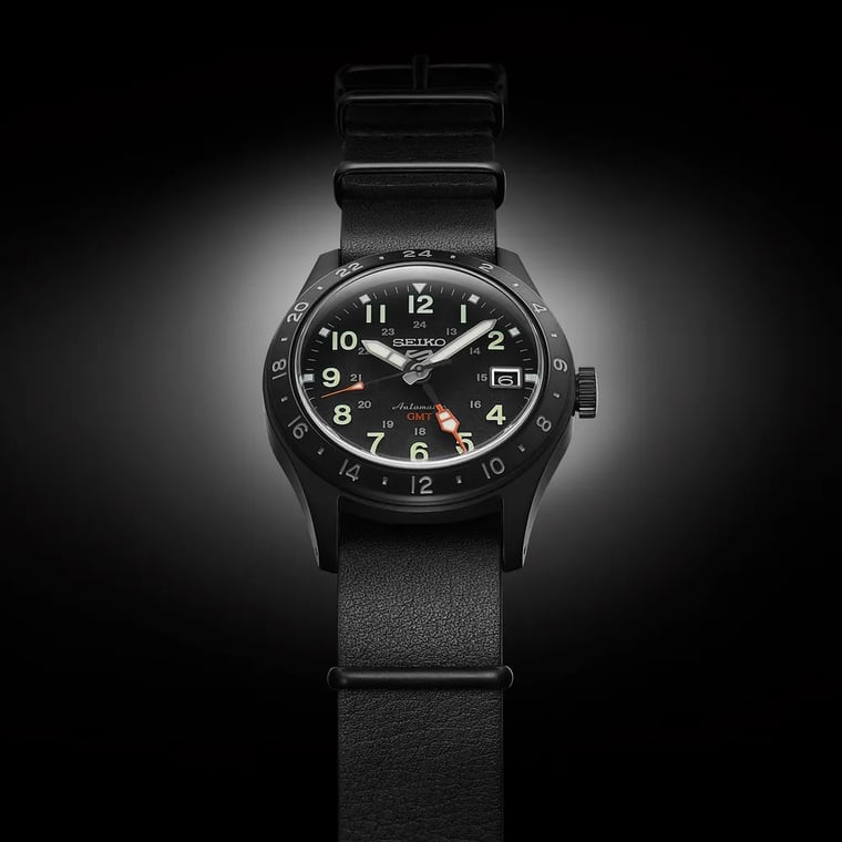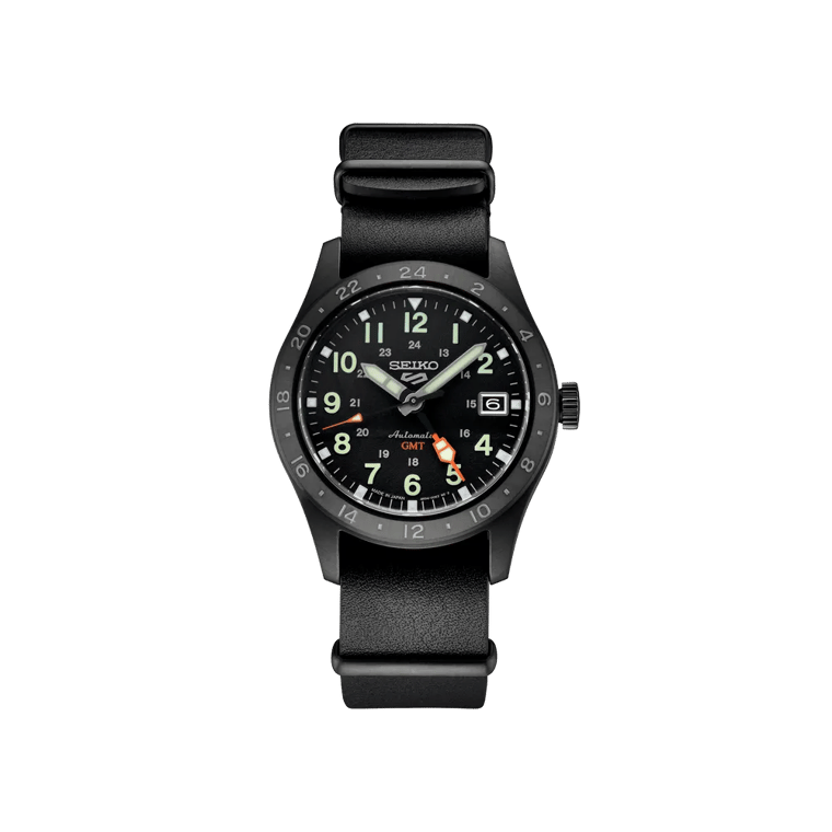 The Seiko SSK025 brings GMT functionality to the 5 Sports Field Series for the first time, combining rugged field watch aesthetics with dual-timezone capability. With its all-black hard-coated case and bold Arabic numerals, this is a watch built for adventure that tracks two time zones simultaneously.