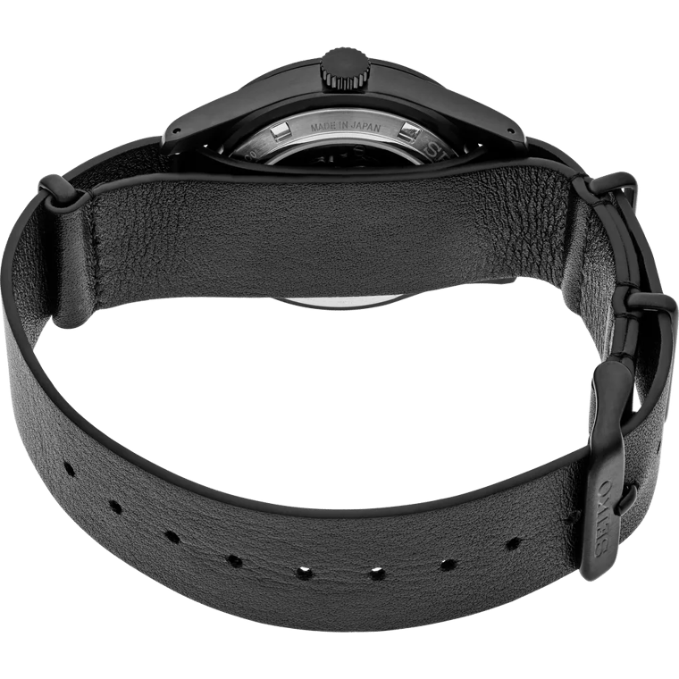 The 39.4mm stainless steel case features a hard coating in black that enhances both durability and aesthetics. At 13.6mm thick with a 47.9mm lug-to-lug, it commands wrist presence while remaining comfortable. A curved Hardlex crystal protects the dial, while the screw-down exhibition caseback lets you admire the 4R34 movement. Water resistance to 100 meters handles outdoor conditions with confidence.