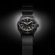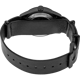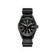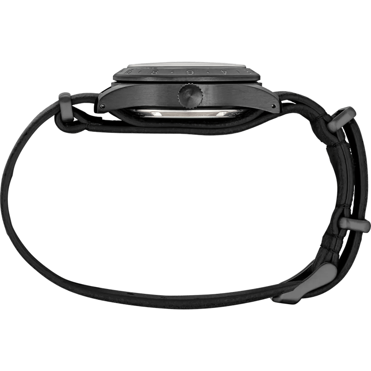 The single-pass black leather strap provides a comfortable, secure fit with a military-inspired aesthetic that complements the field watch design. The 20mm lug width offers plenty of aftermarket options for personalization.