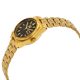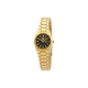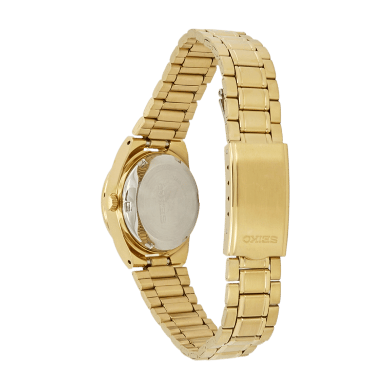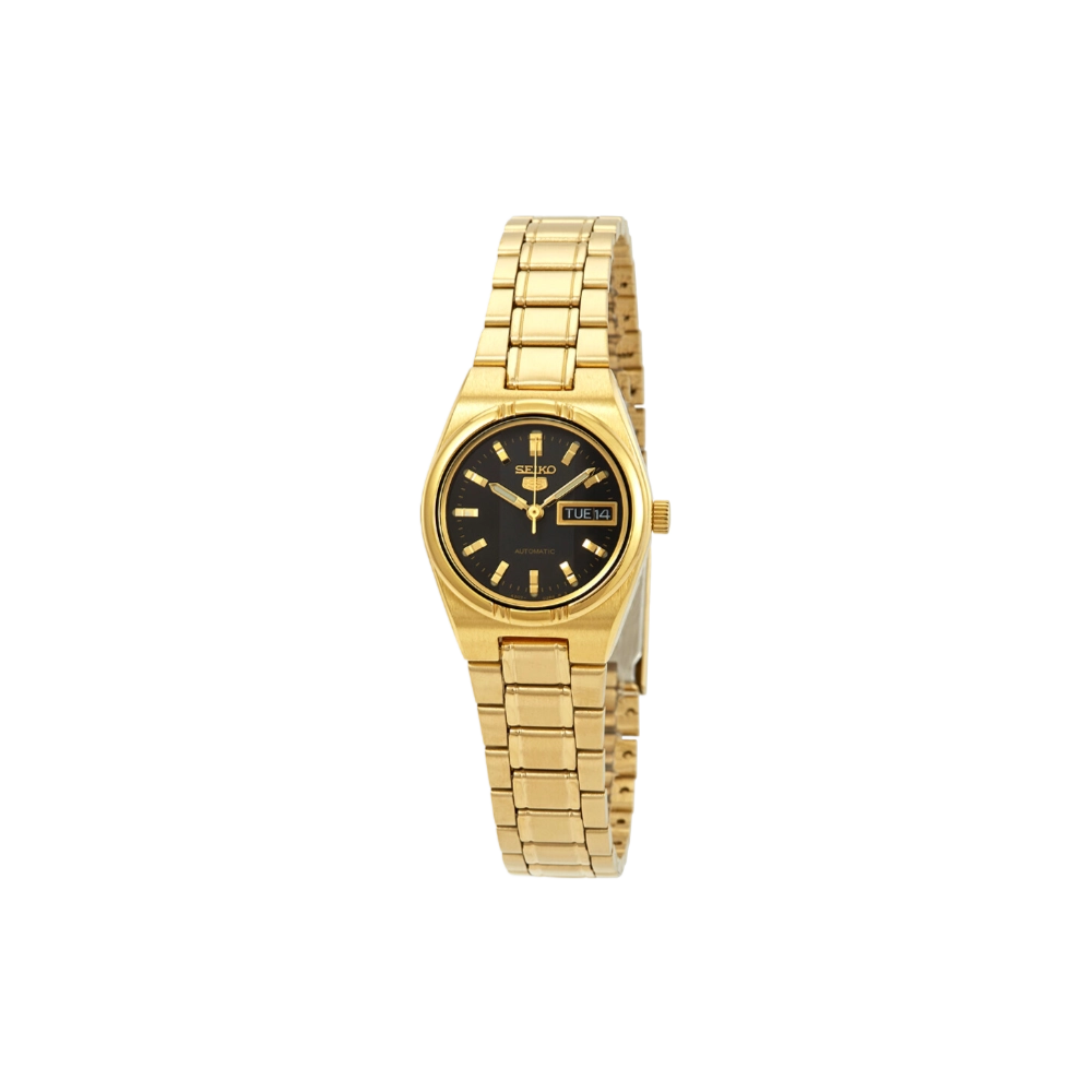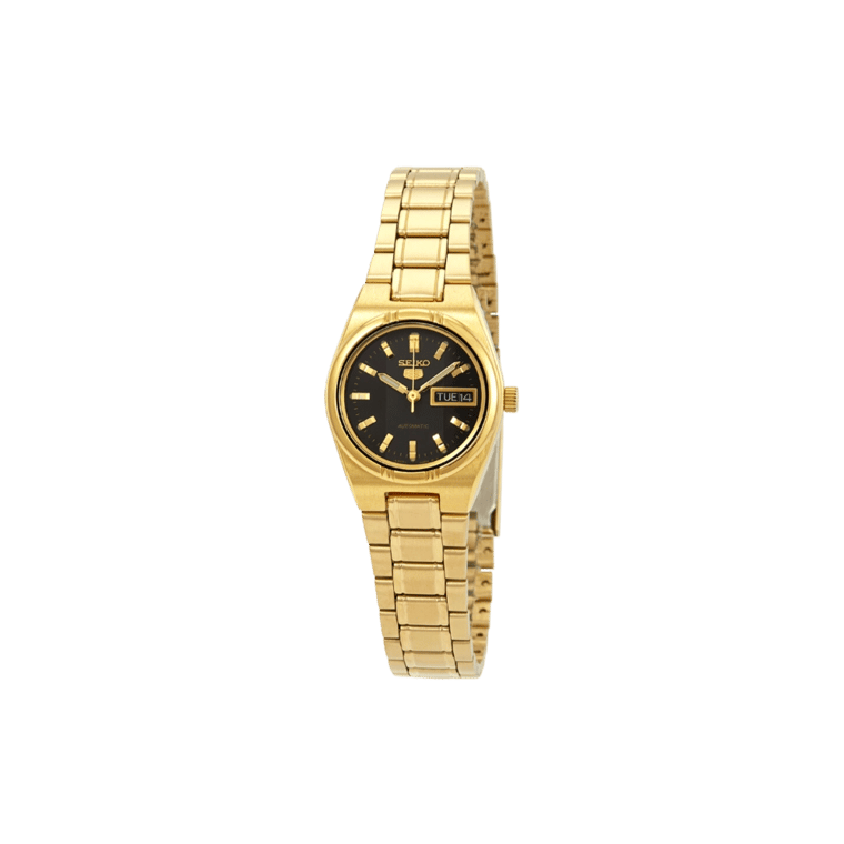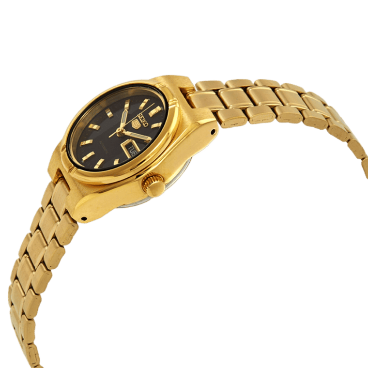 The Seiko SYM602 is a standout timepiece in the Seiko 5 series, designed for women who value both style and function. Its compact 23mm yellow gold-tone stainless steel case frames a black dial, complemented by luminous gold-tone hands and index hour markers for excellent readability. Minute markers line the outer rim, while a practical day-date display sits at the 3 o’clock position, enhancing everyday usability.