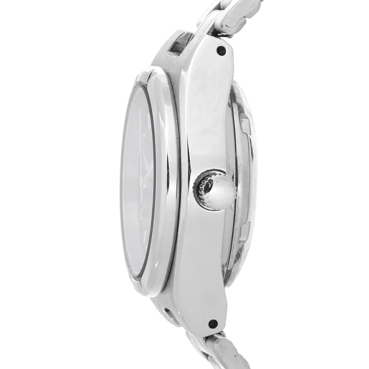 The 24mm stainless steel case sits at 10mm thick — a comfortable size for smaller wrists. A Hardlex crystal protects the dial, while 30-meter water resistance covers everyday splashes and hand washing.