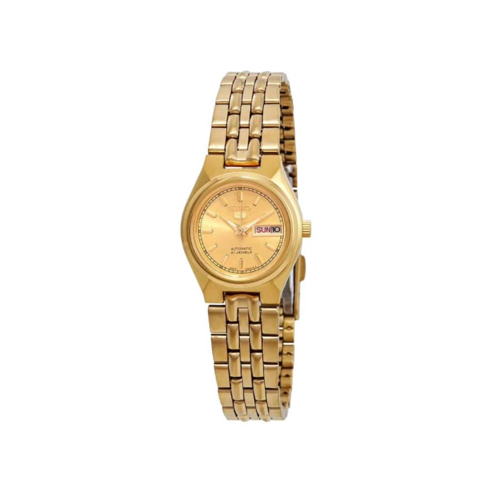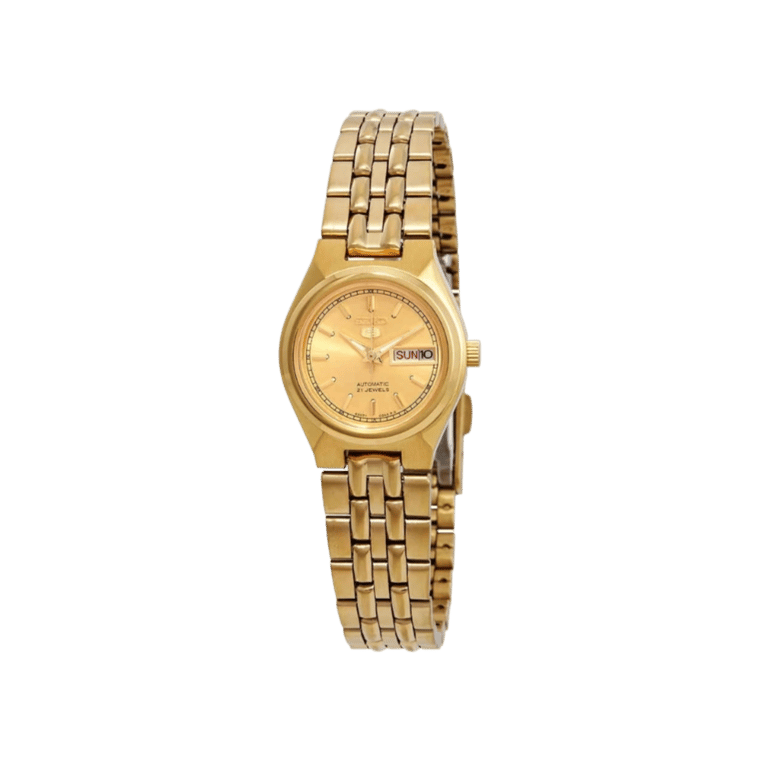 The Seiko SYMA04, part of the esteemed Seiko 5 series, is a women’s automatic timepiece that combines functionality with a refined aesthetic. Its 27mm yellow gold-tone stainless steel case houses a gold dial, complemented by luminous hands and index hour markers for enhanced readability. The dial features a day and date display at the 3 o’clock position, managed by the reliable Seiko Caliber 4207 automatic movement, offering a 24-hour power reserve.