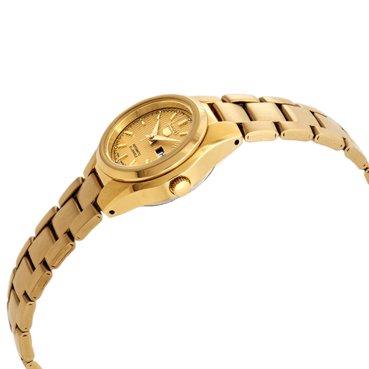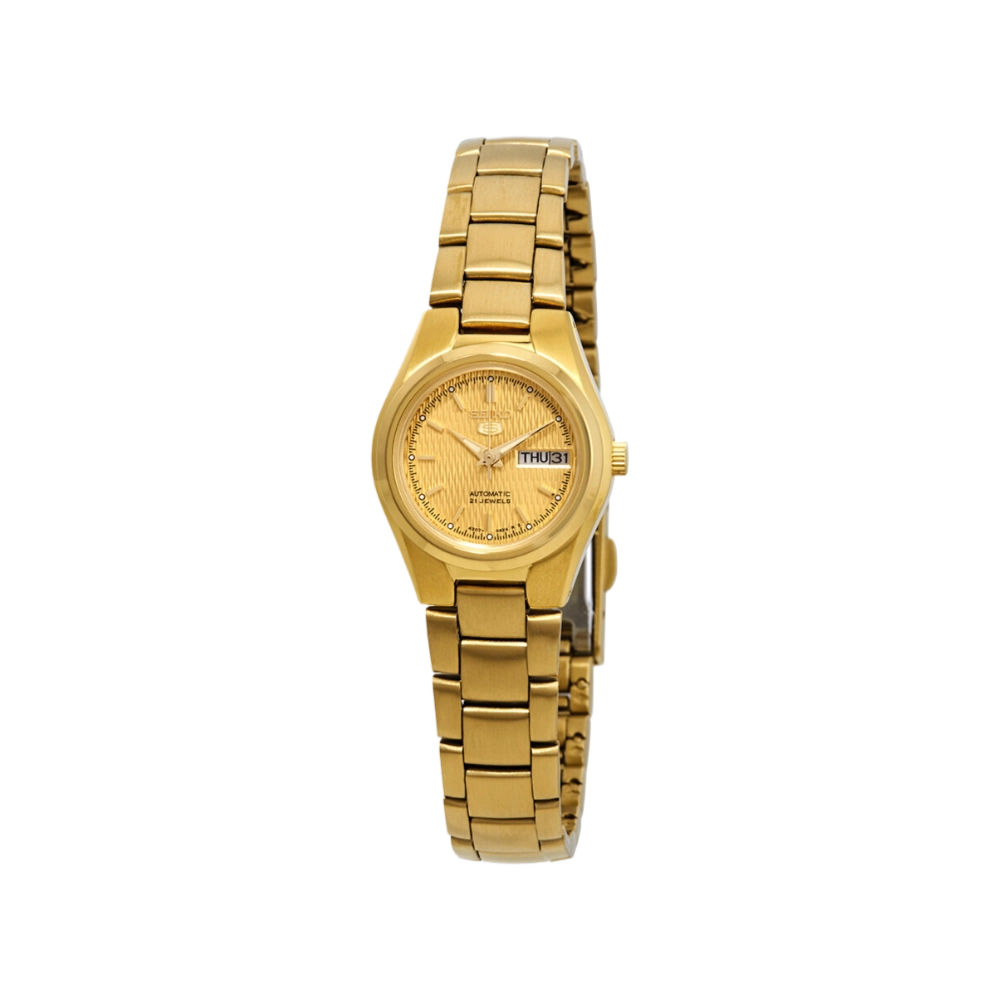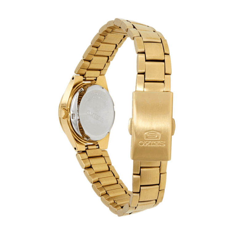 The Seiko SYMC18 stands as a shining example of the brand’s renowned craftsmanship, blending practical design with enduring elegance. Part of the iconic Seiko 5 series, this watch features a 25mm stainless steel case coated in gold-tone plating, offering a compact yet visually striking profile ideal for everyday wear. Its matching gold-tone dial is adorned with luminous hands and indices, ensuring excellent legibility, complemented by a day-date display at 3 o’clock a hallmark of the Seiko 5 series.