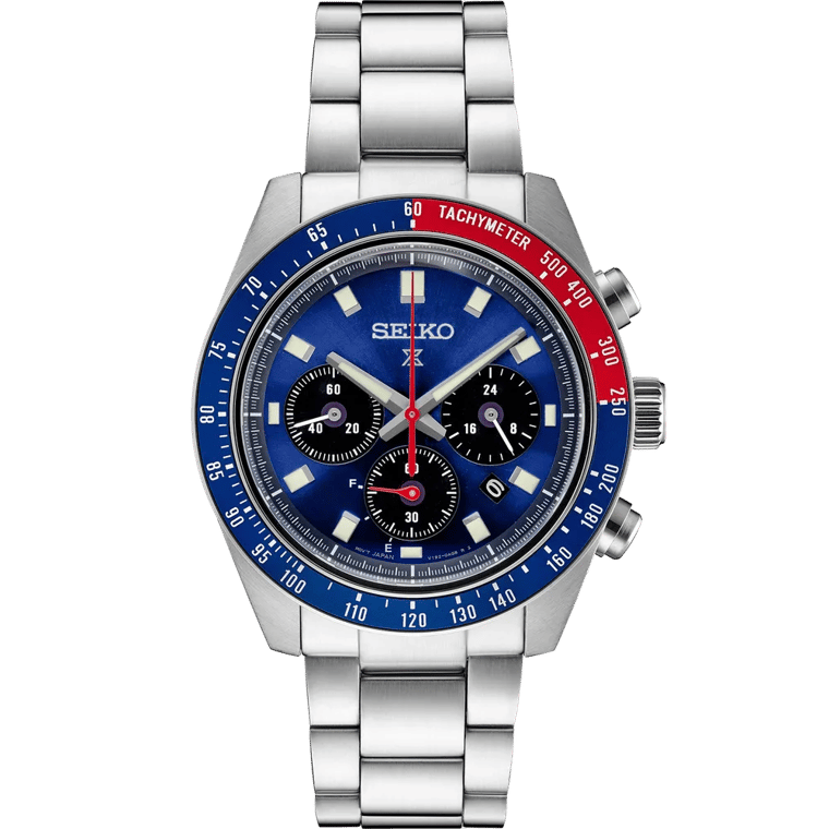 The Seiko SSC913 Prospex Speedtimer channels the spirit of motorsport timing with its bold Pepsi-colored tachymeter bezel and precision solar chronograph movement. Part of the Speedtimer collection, this watch delivers professional-grade timing functionality wrapped in a head-turning design inspired by the world of racing.