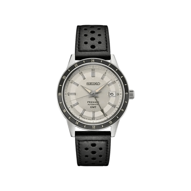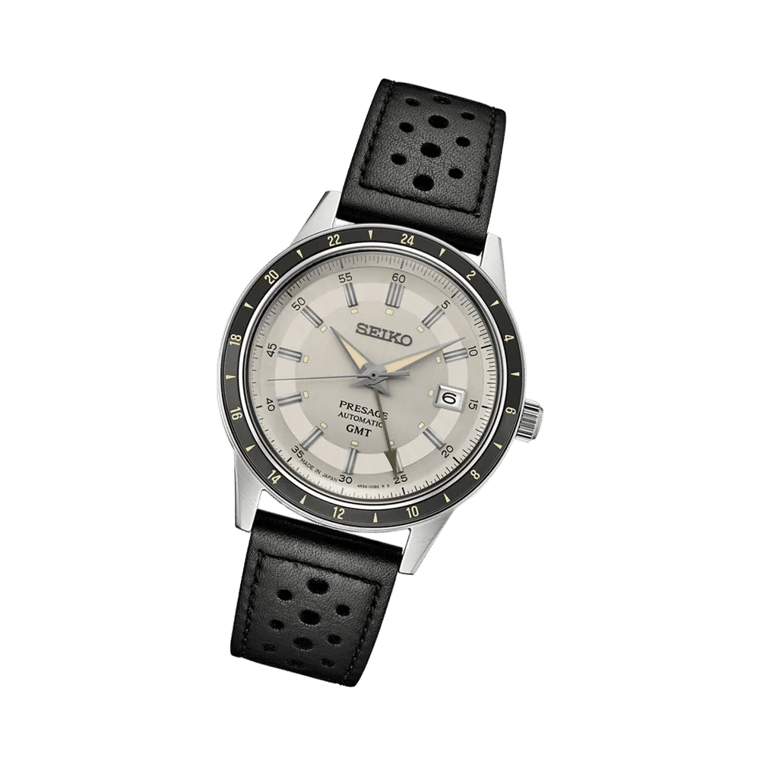 The Seiko SSK011 from the Presage Style60s collection brings 1960s racing-inspired design to a modern GMT timepiece. With its distinctive two-tone bezel, perforated leather strap, and refined ivory dial, this watch captures the golden age of motor racing while delivering practical dual-timezone functionality.
