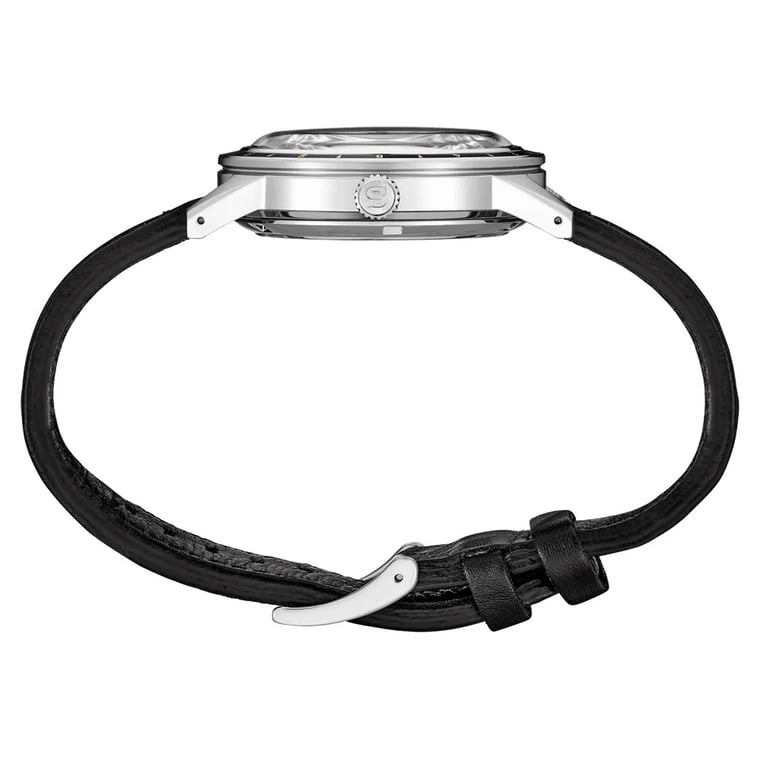 The black perforated leather strap pays homage to classic racing watch designs, offering both style and breathability. A deployant clasp provides secure closure with easy on-off convenience. The 20mm width allows for easy strap changes.