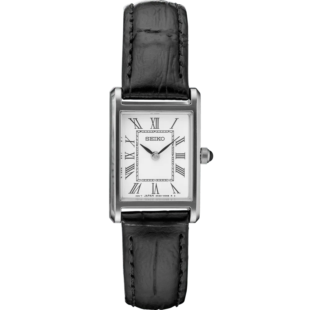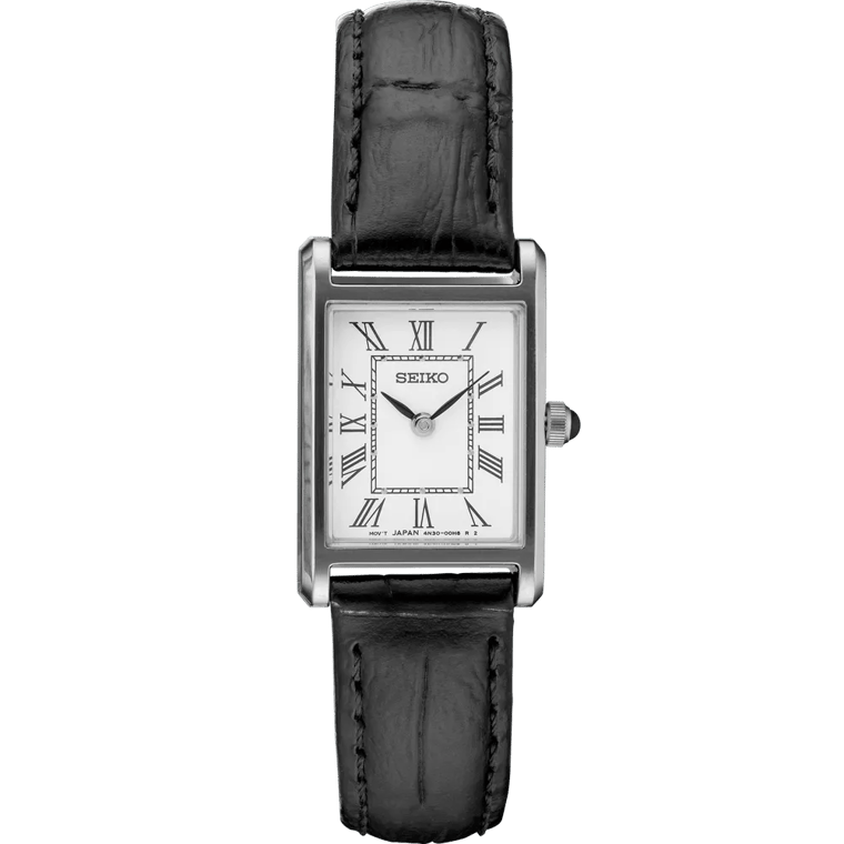 The Seiko SWR053 from the Essentials collection channels the classic appeal of rectangular dress watches with refined simplicity. Its slender profile and clean white dial with Roman numerals make it a sophisticated companion for any occasion, from the office to an evening out.