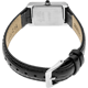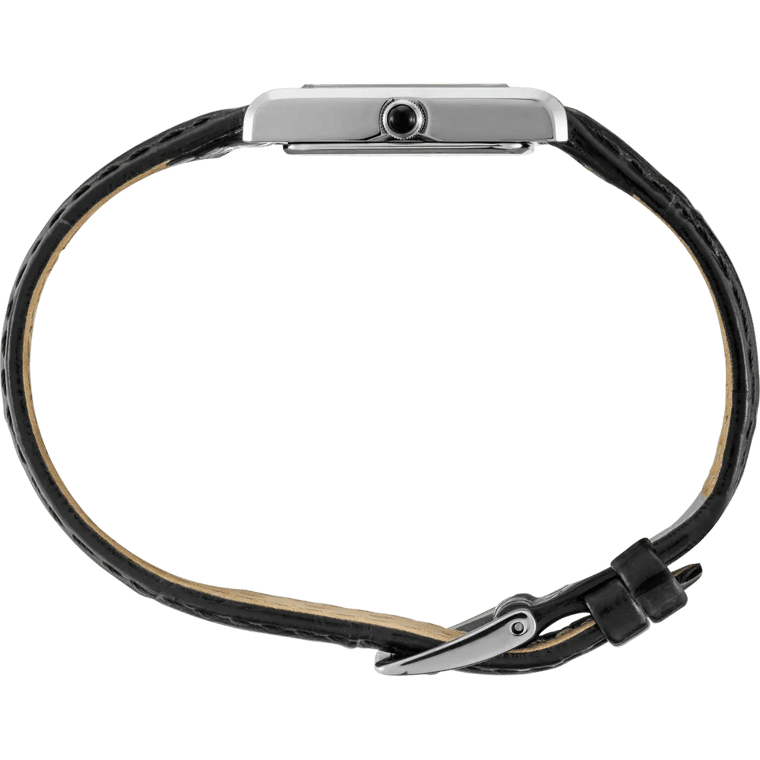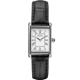 The white dial features elegant black Roman numerals at each hour position, creating a timeless look that pairs beautifully with the rectangular stainless steel case. Fine black hands sweep across the dial with quiet precision, while a subtle inner track adds depth. The cabochon crown provides a touch of jewelry-inspired luxury, elevating the watch beyond its everyday price point.