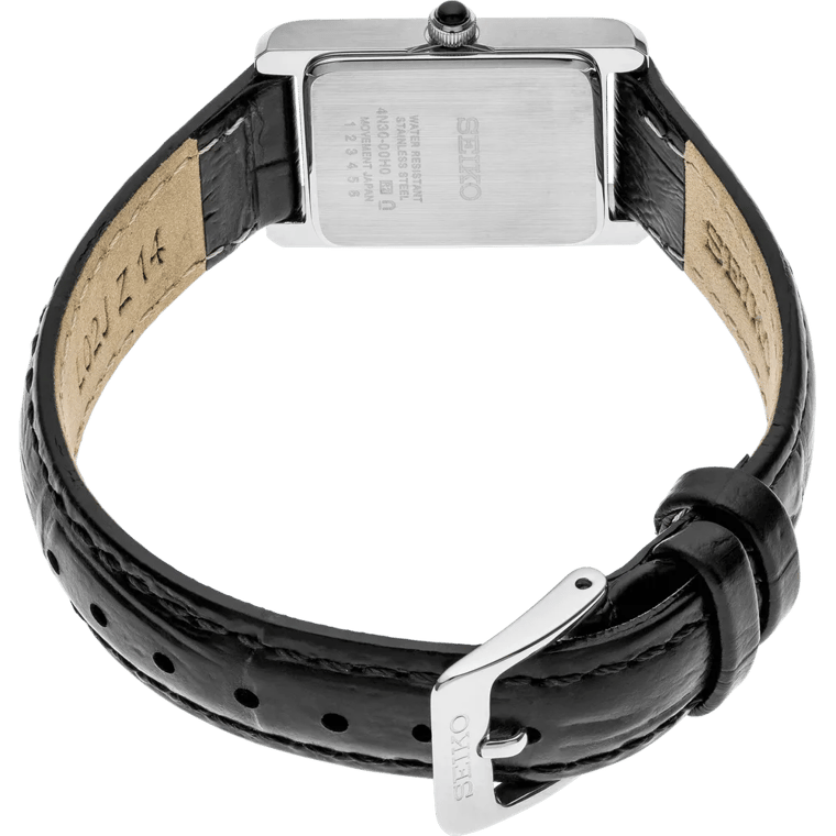 The stainless steel rectangular case measures a delicate 18.9mm across with an ultra-slim 4.9mm profile, sitting gracefully on the wrist. A Hardlex crystal protects the dial, while the solid caseback ensures a clean, finished look. Water resistance to 30 meters handles everyday splashes.
